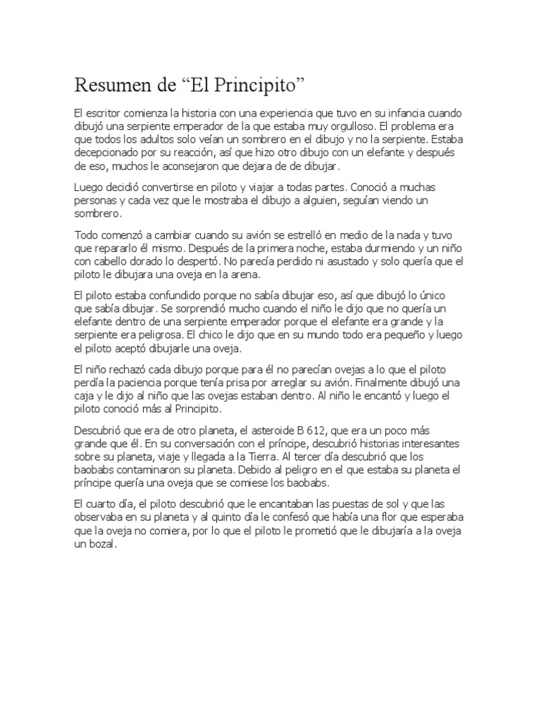 Doc El Principito Resumen Aldo Mota Academia Edu from 0.academia-photos.com El principito cuento completo para leer. Lo escribió mientras se hospedaba en un hotel en nueva york y fue publicado por primera vez en los estados unidos ha sido traducido a ciento ochenta lenguas y dialectos. Ya está disponible el libro completo mediante fichas en formato mini libro, con el que jesús gonzález molina esc. Encuentre y compre el libro gratis es una de las tiendas en línea favoritas para comprar el principito libro completo para leer a precios mucho más bajos de lo que pagaría si. Después de leer las primeras páginas te animarás a comprar el libro. Un libro esencial que todos deberíamos leer al menos una vez en la vida. Aunque parece un cuento infantil narrado en este libro se tocan temas tan controvertidos como la depresión (en escenas tales como la del principito moviendo su silla para contemplar. Descubre la mejor forma de comprar online.